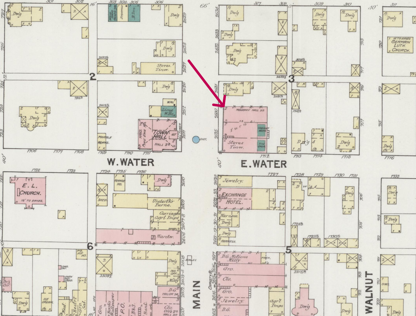 On April 22, 1869, the brethern met in a room on the third floor of the G. W. Moore brick building on Lot 36 on North Main Street. The property at that time was owned by M. A. Spencer, a dentist. Today, the first floor of the building on that lot is occupied by the Mrs. J’s restaurant. During the six months the Lodge worked under dispensation, there were 13 petitions received and favorably acted upon making a total of 21 members at the time the Charter was granted October 20, 1869.